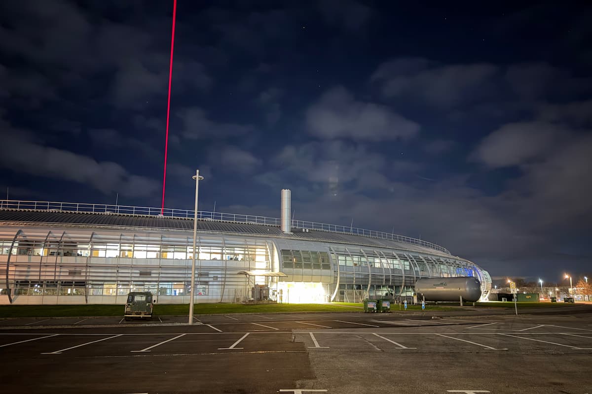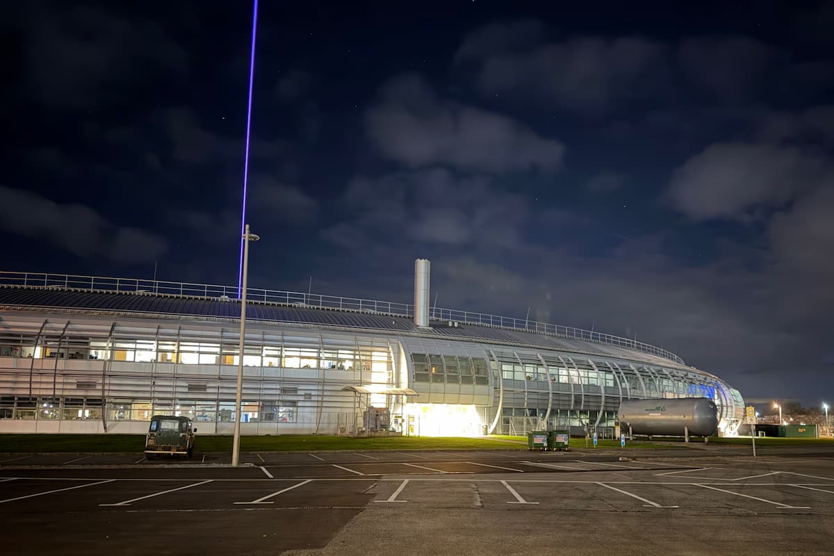 Neithiwr, es i i'r campws gwyddonol Harwell. Maen nhw'n dathlu wyth deg mlynedd ers eu sefydlu, felly mae llawer o ddigwyddiadau ganddyn nhw eleni. I groesawu'r flwyddyn newydd, saethodd y Diamond Light Source laser i mewn i awyr y nos.